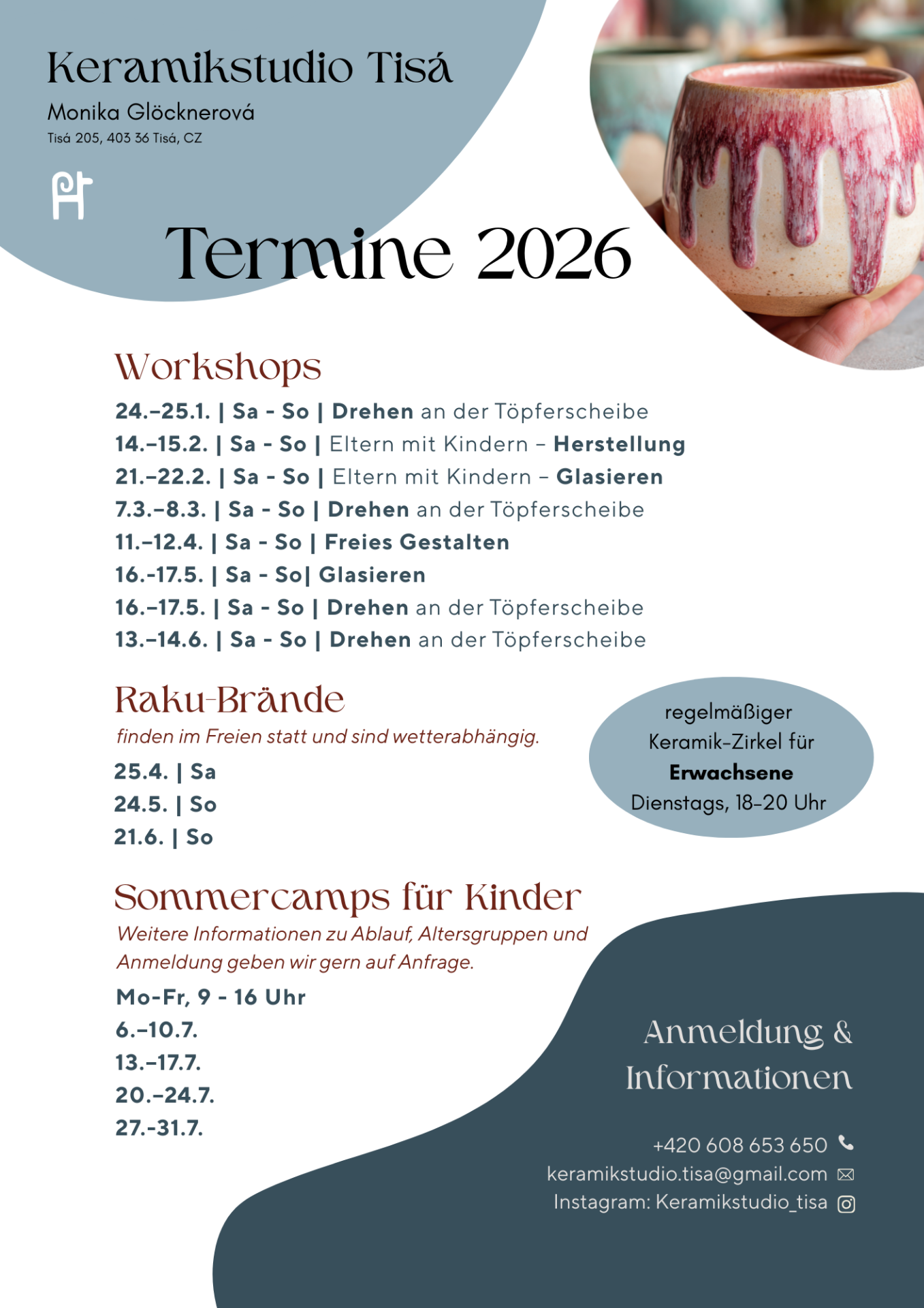 Hier findet ihr eine Übersicht aller geplanten Workshops, Märkte und Sommercamps im Keramikstudio Tisá.